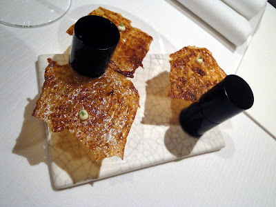 The squid was the white stuff, made to look like risotto, and the black stuff was the risotto, dyed with a vegetable and dehydrated into a cracker. Kropek anyone?